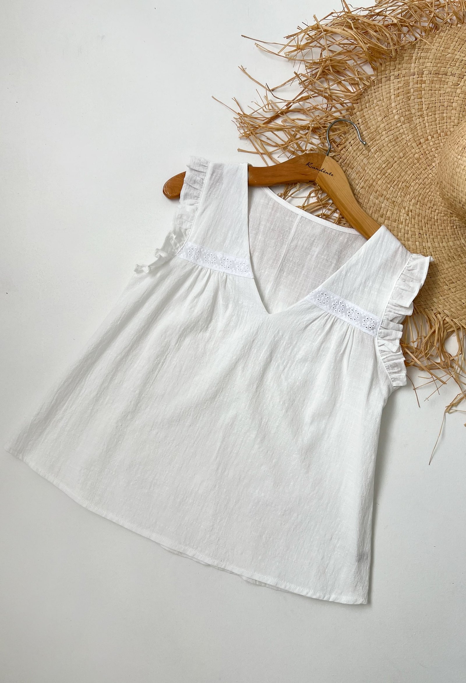 BLUSA DE LINO ALGODON CON DETALLES DE PUNTILLA, ESCOTE EN V Y VOLADOS EN SISA