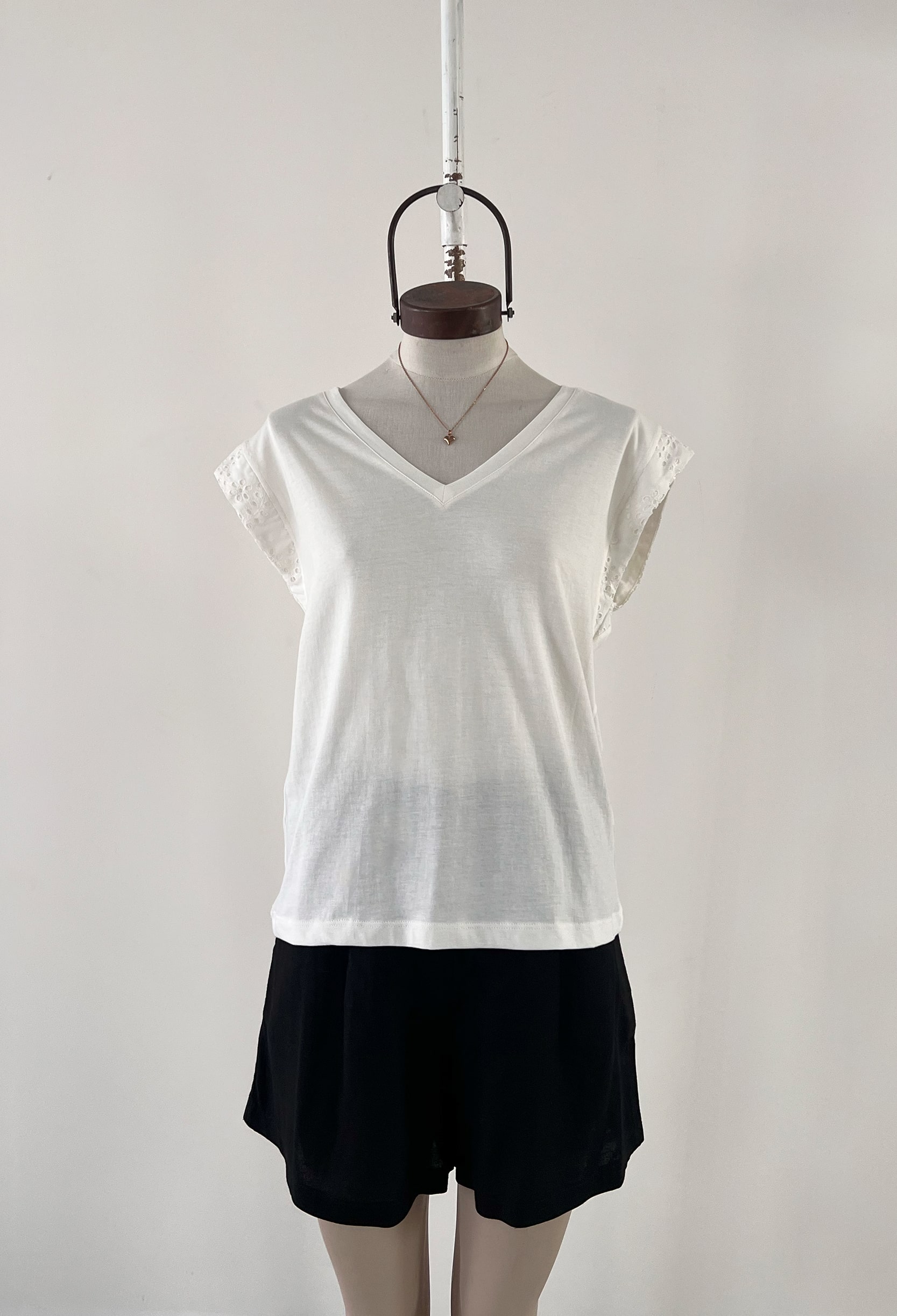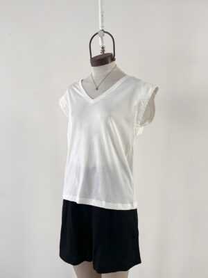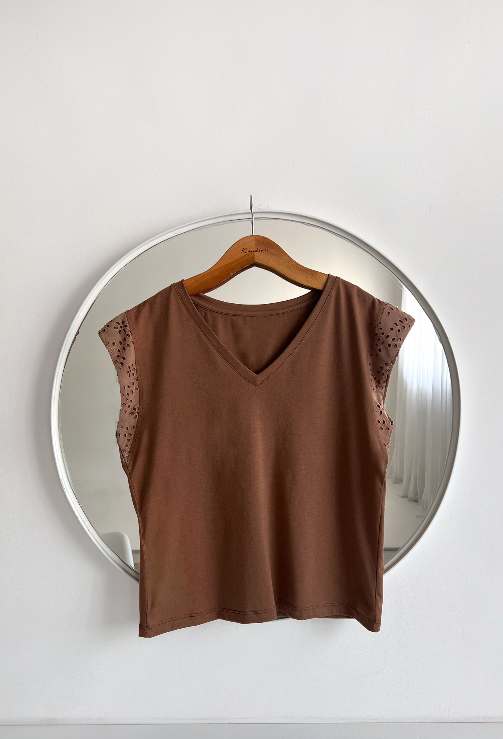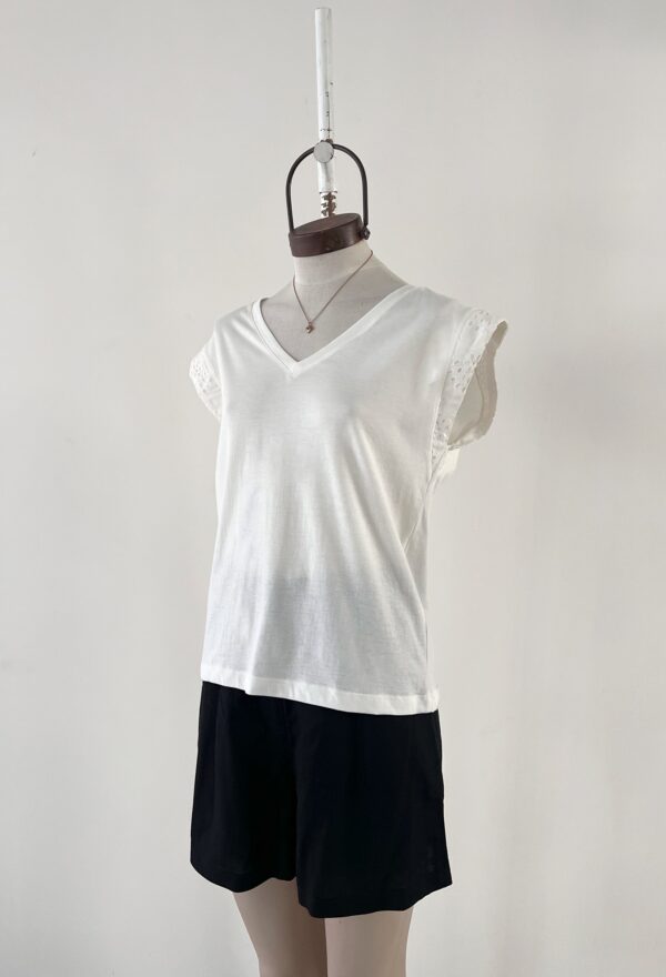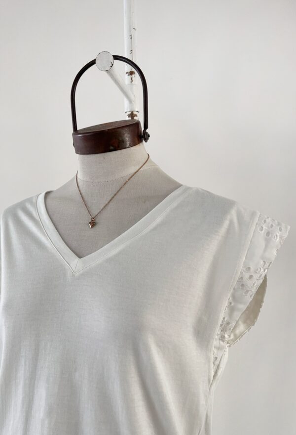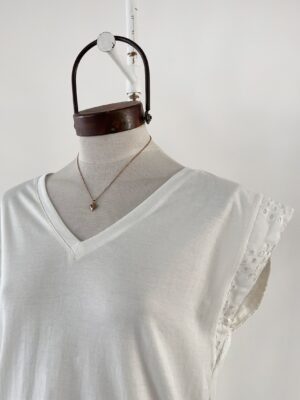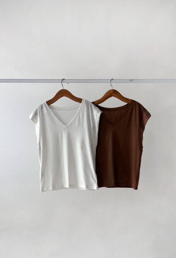 REMERA DE JERSEY ALGODON 30/1 CON ESCOTE V Y BRODERIE EN LA SISA