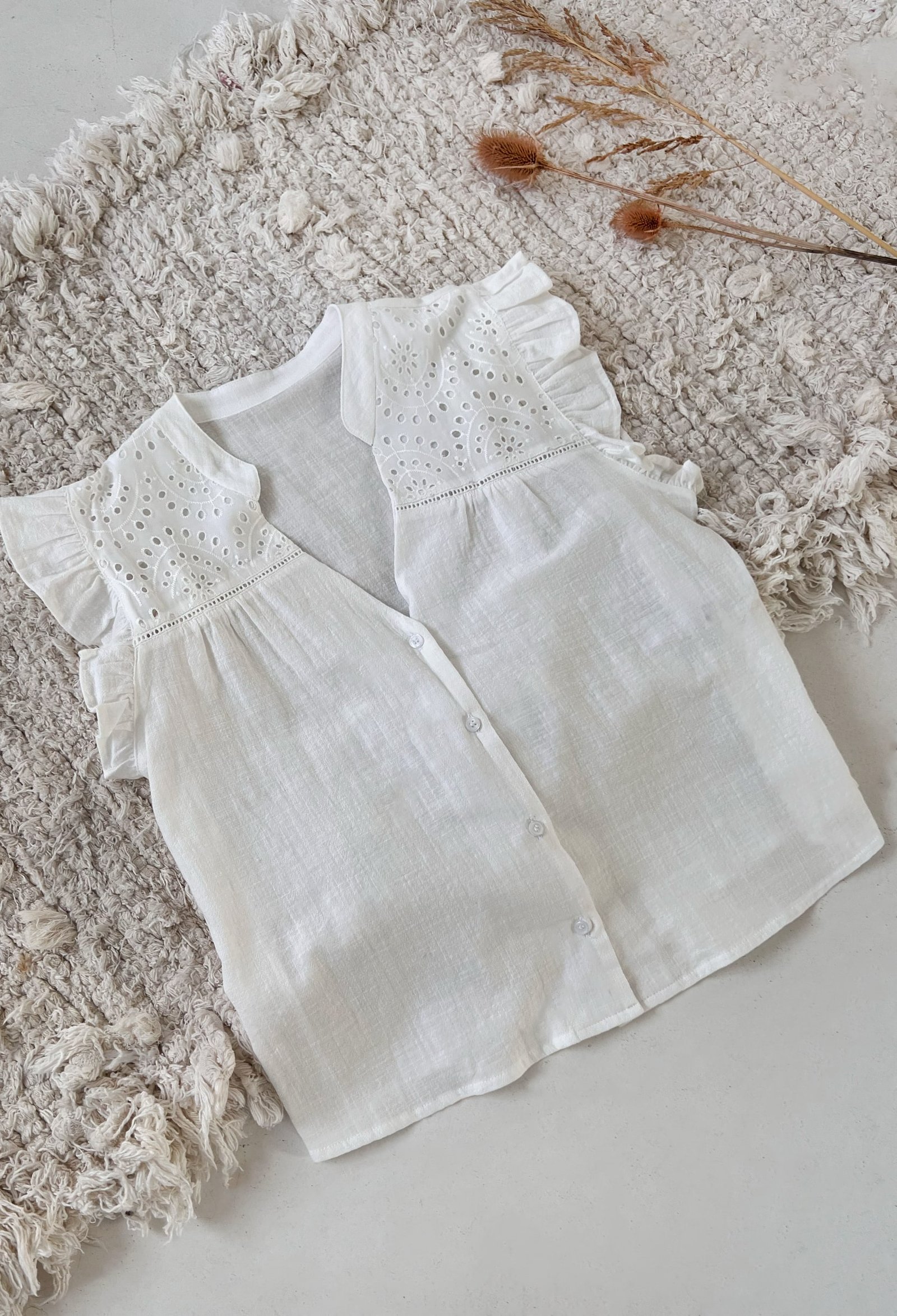 CAMISA DE LINO ALGODON CON VOLADOS EN LA SISA, BRODERIE Y PUNTILLA EN EL CANESU DELANTERO