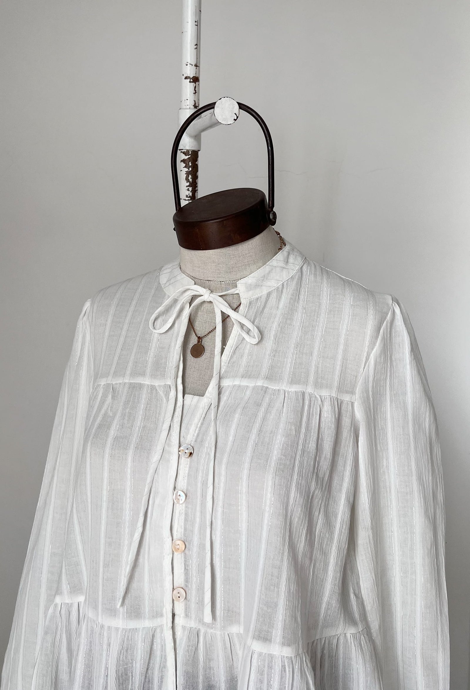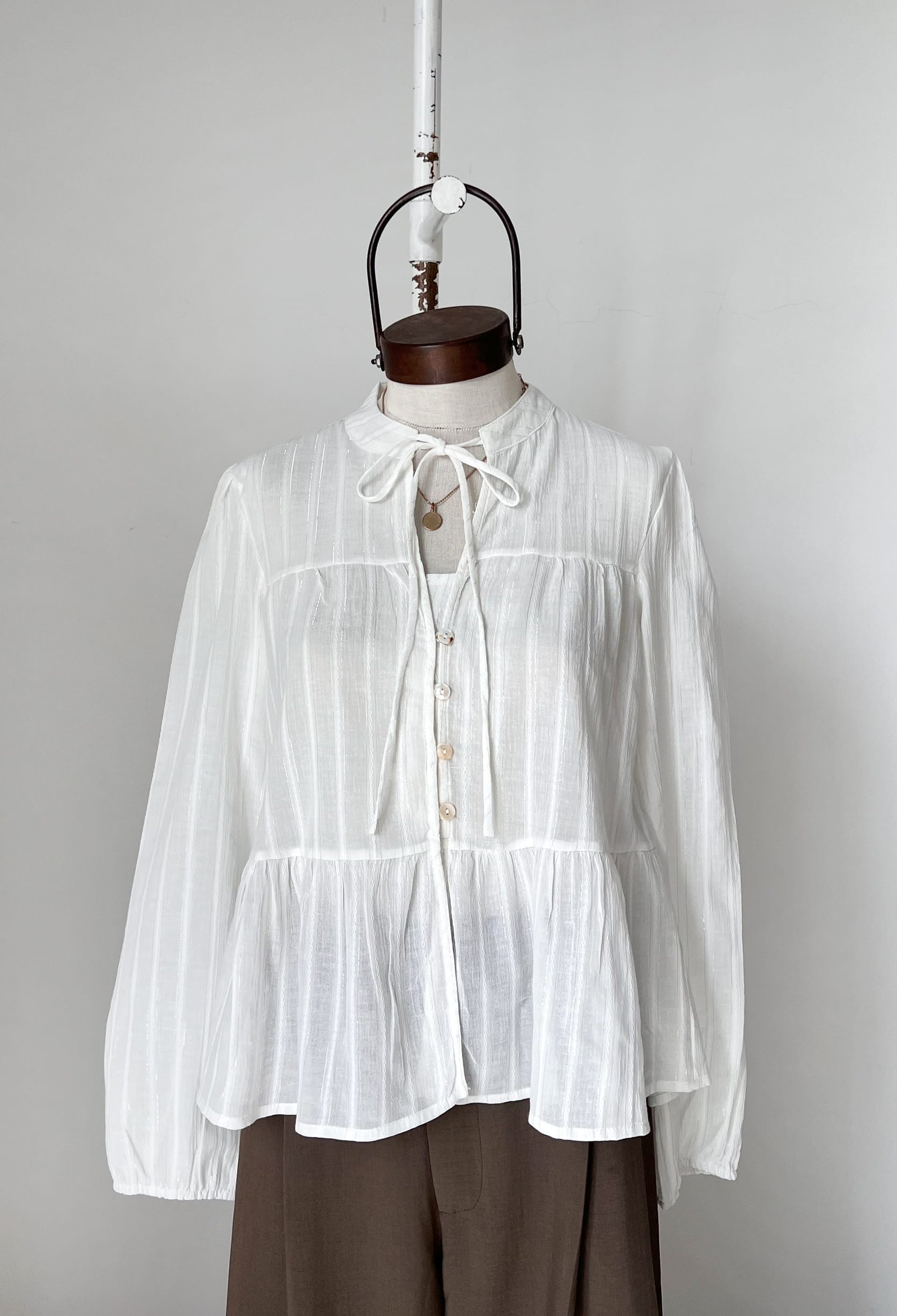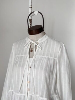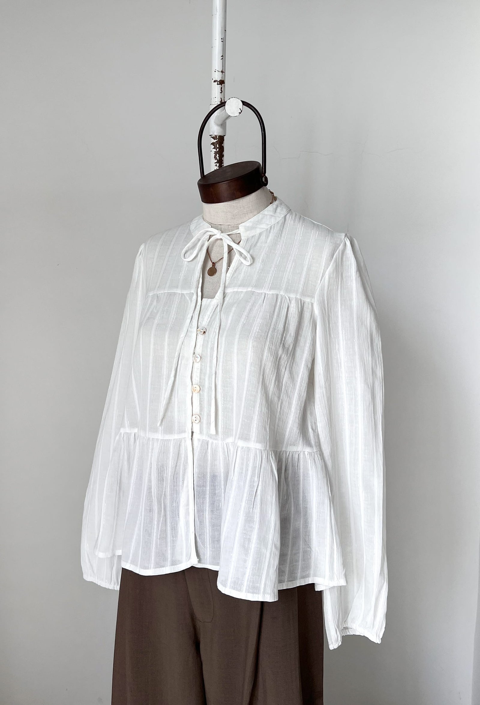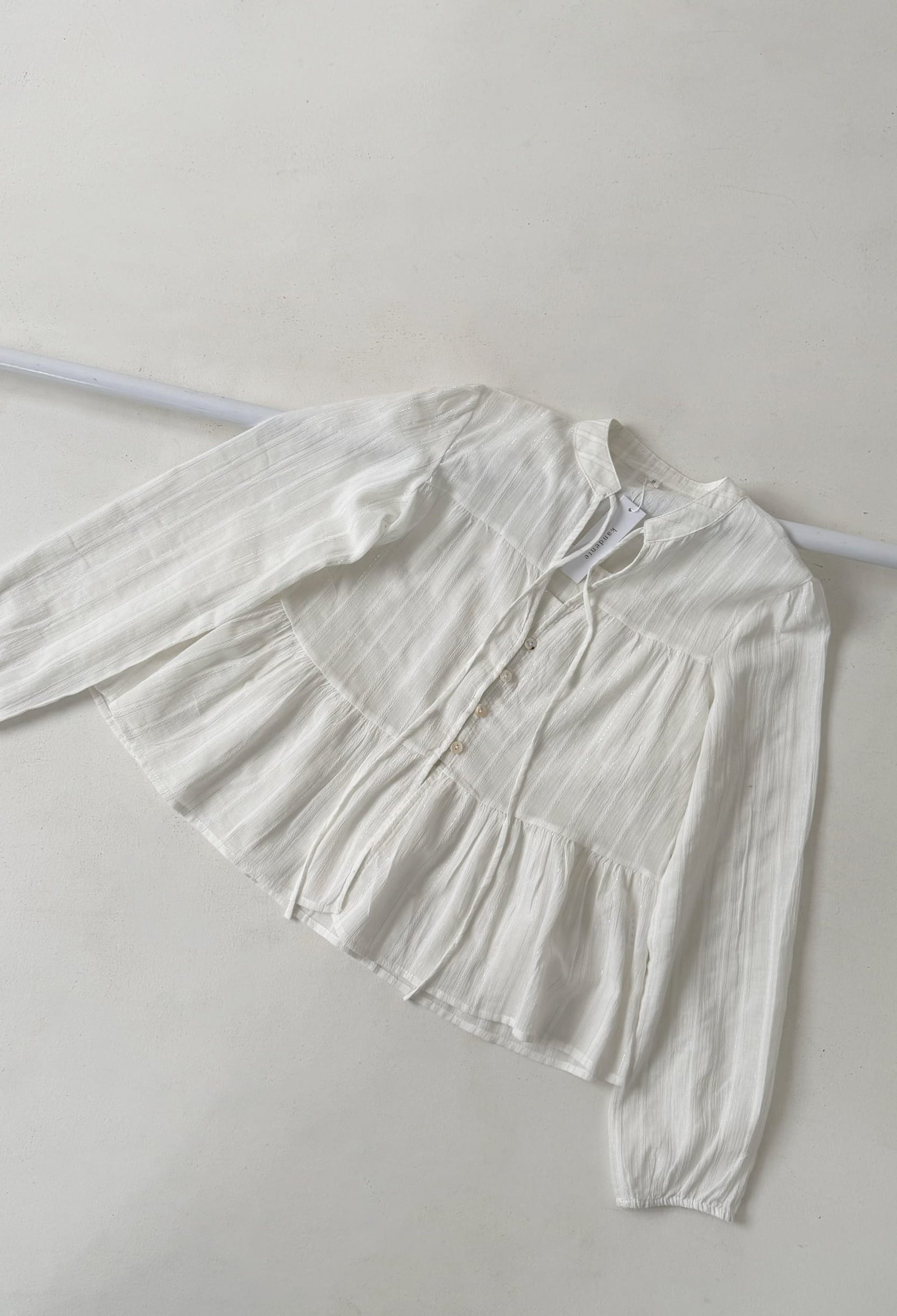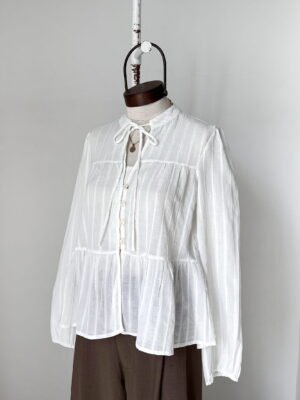 BLUSA CON DETALLES TIPO LUREX, CUELLO MAO CON TIRAS ANUDABLES Y CANESU EN LA ESPALDA