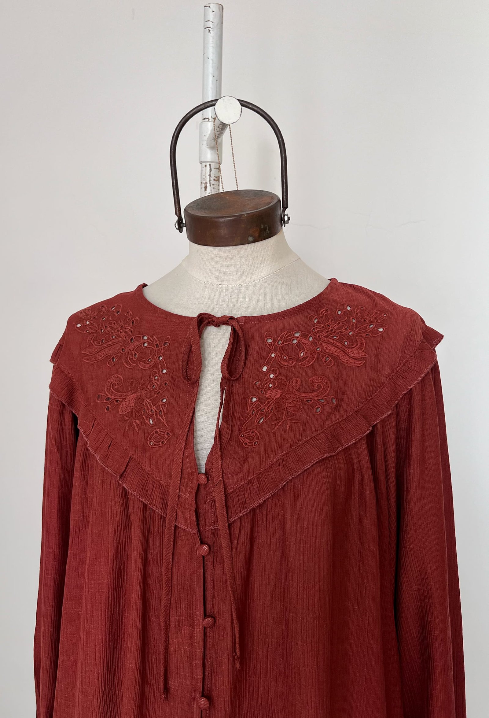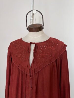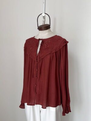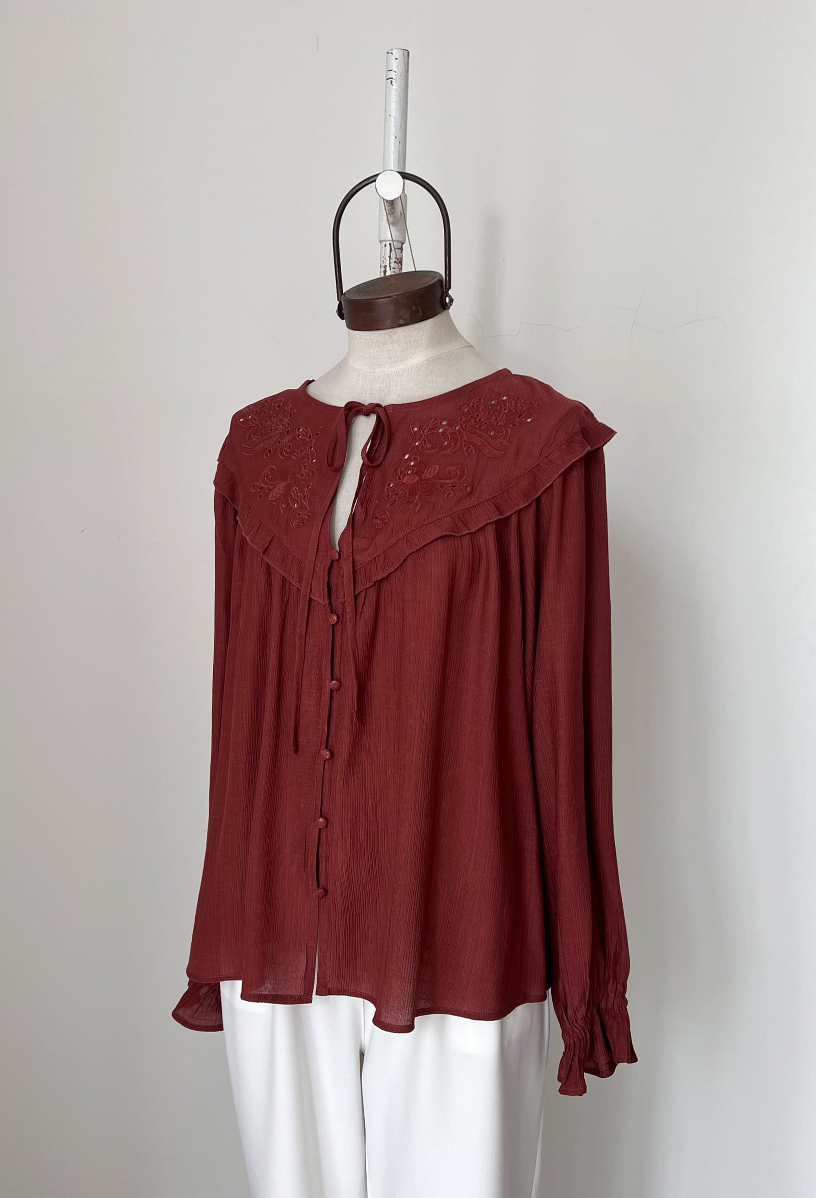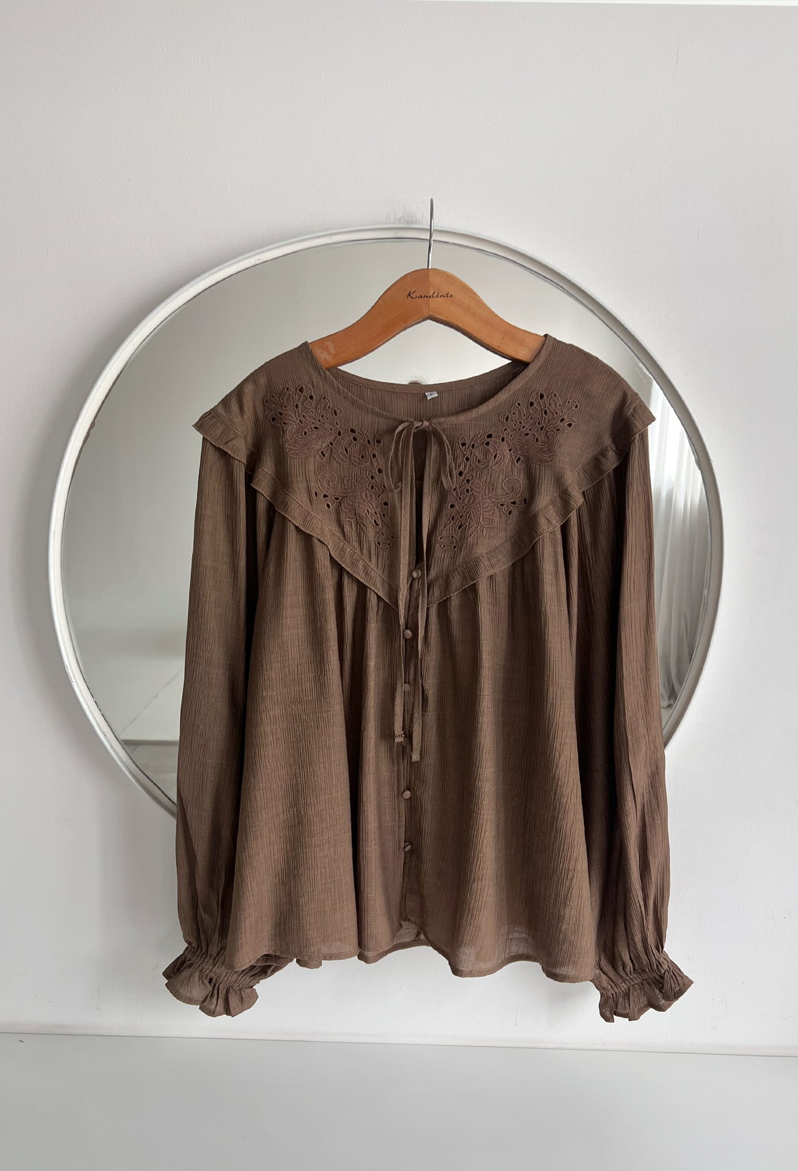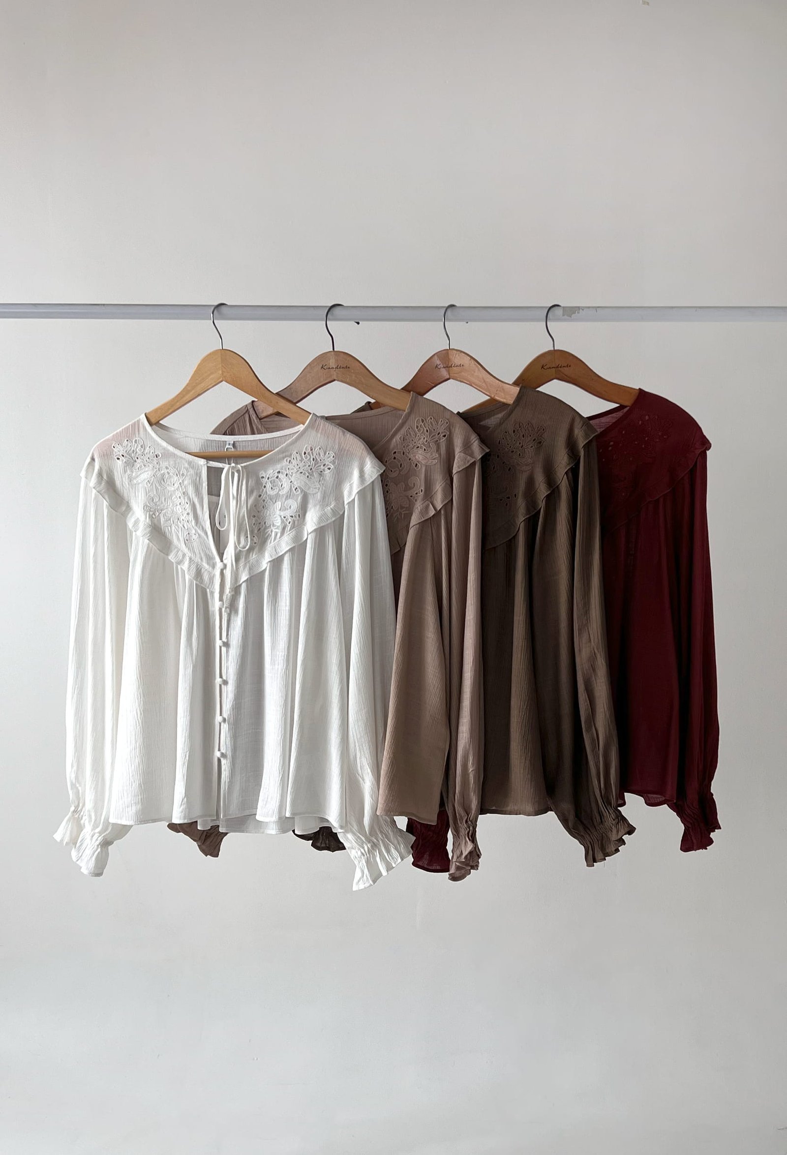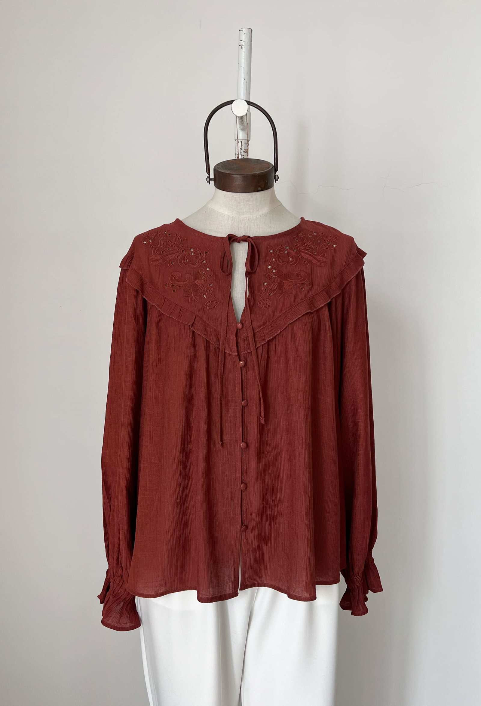 BLUSA BORDADA CON VOLADOS Y BOTONES FORRADOS
