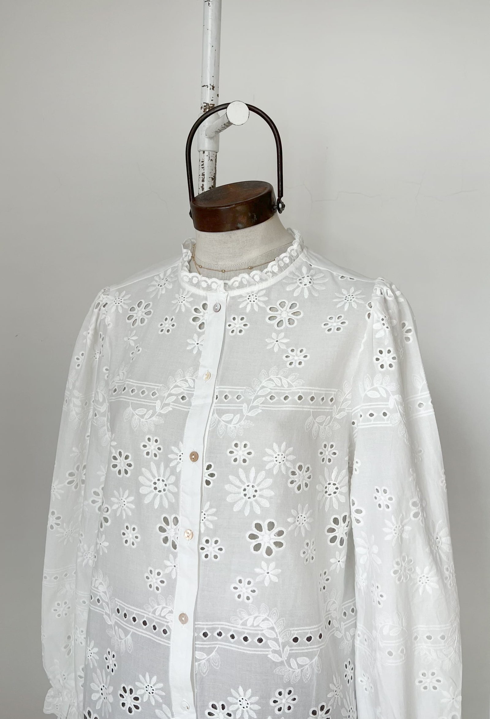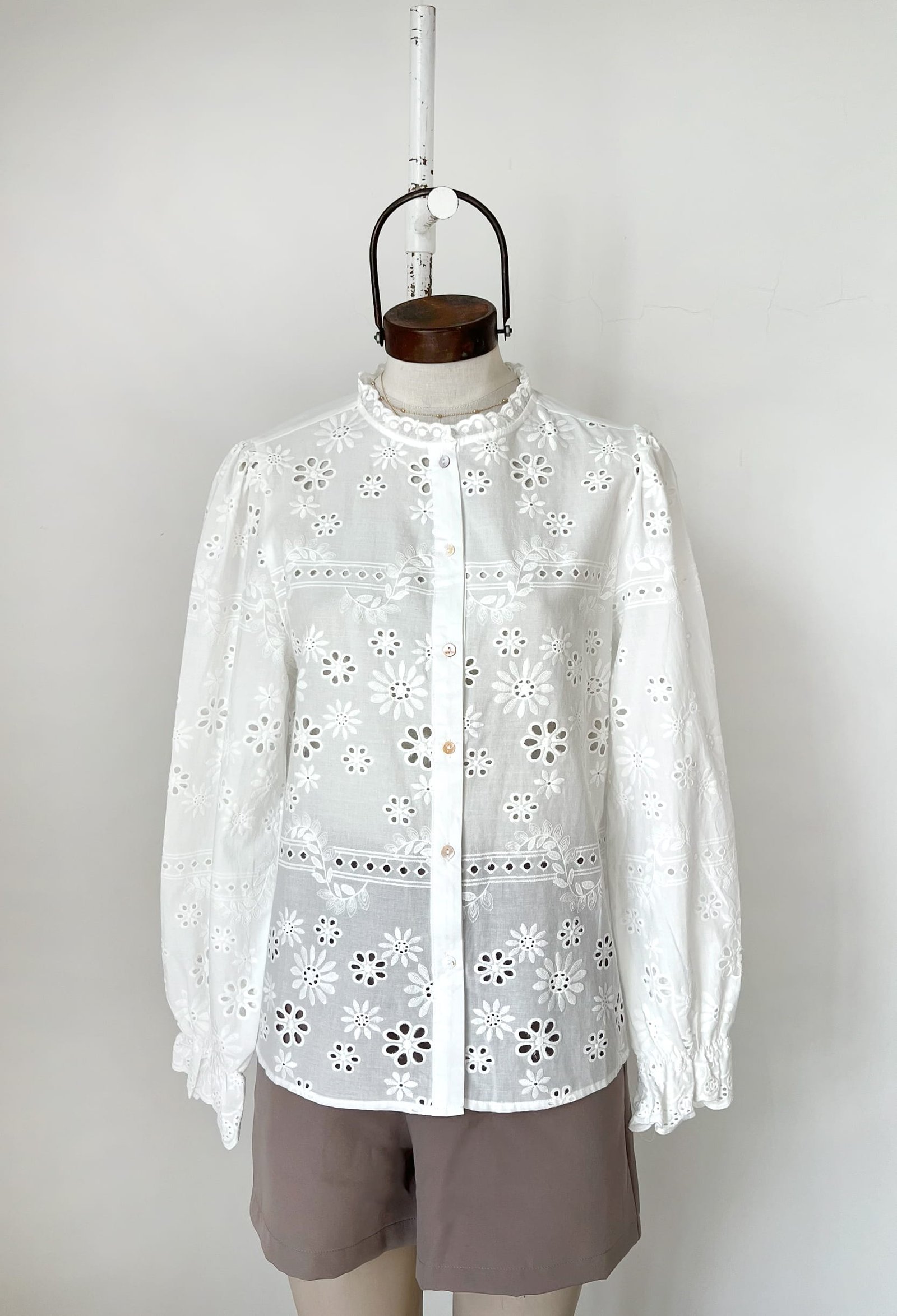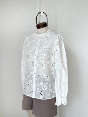 CAMISA DE BRODERIE CON ELASTICO EN PUÑOS Y VOLADOS EN CUELLO