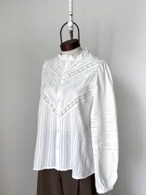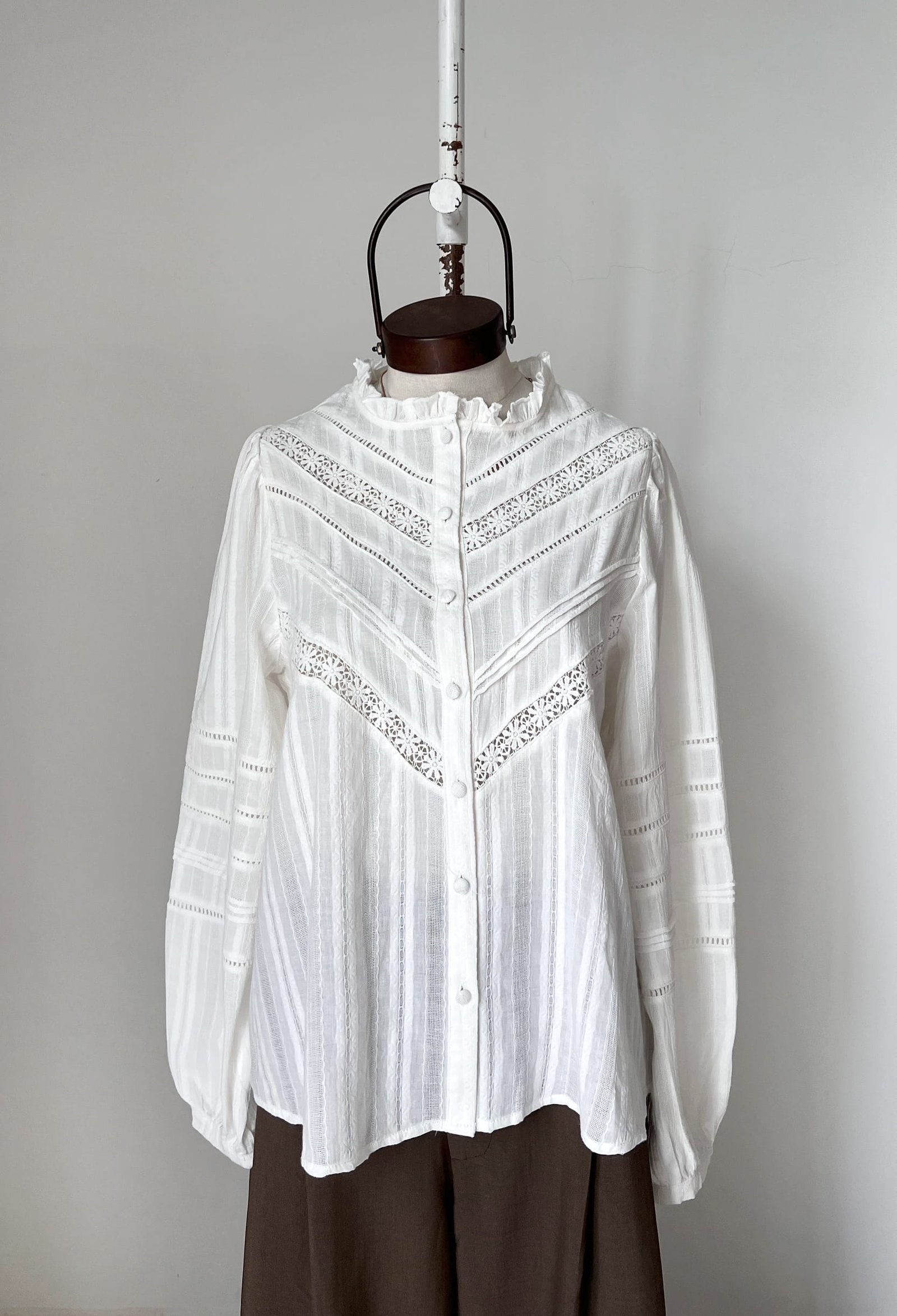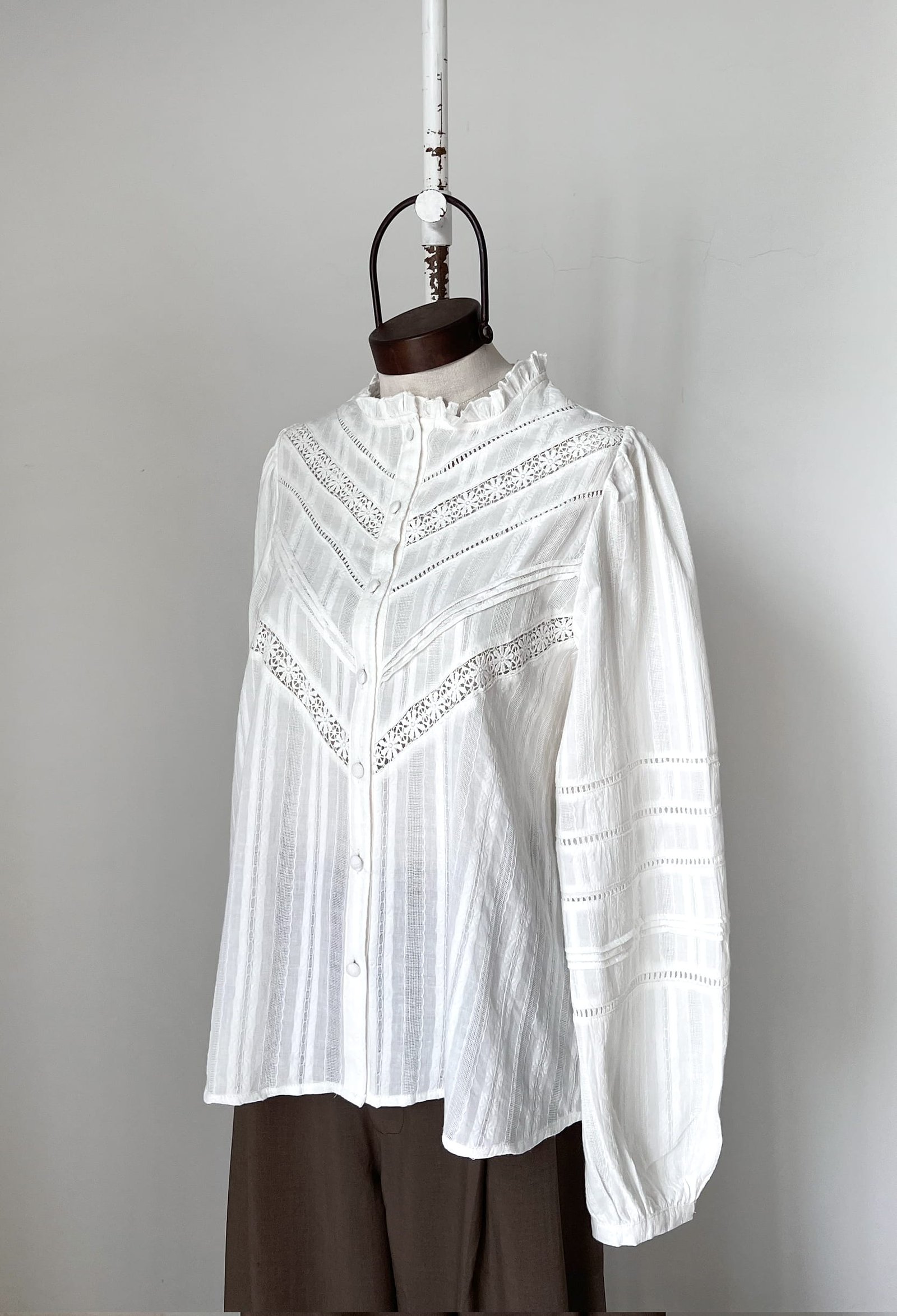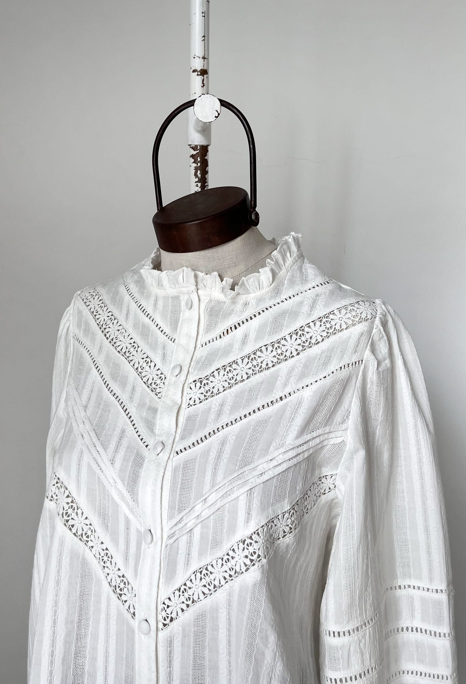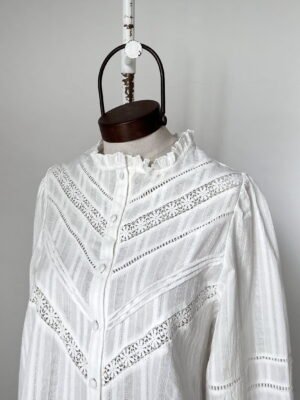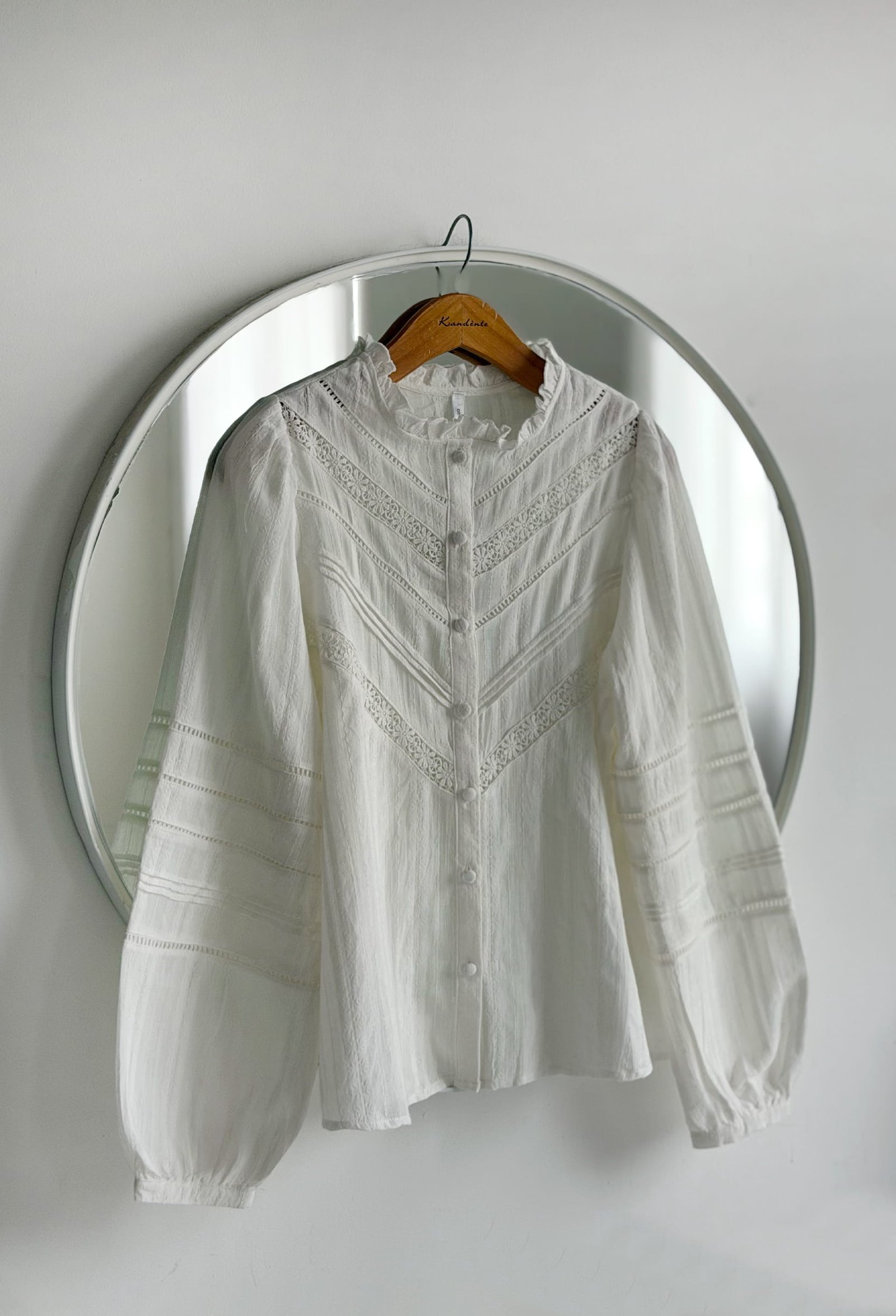 CAMISA DE BRODERIE, CUELLO CON VOLADOS Y ELASTICO EN PUÑOS