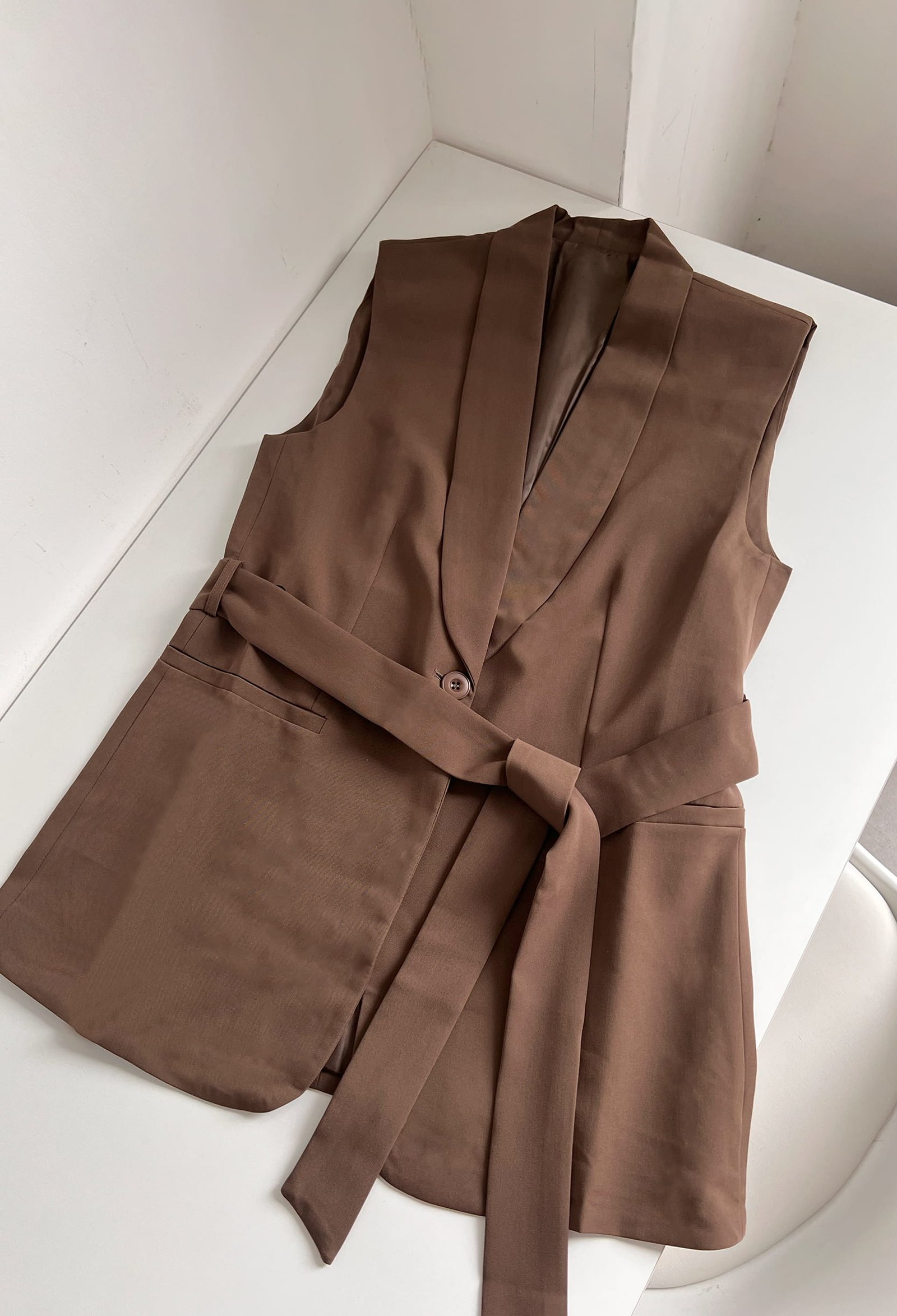 CHALECO FORRADO CON HOMBRERAS, PASACINTO EN LA CINTURA Y LAZO