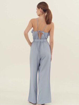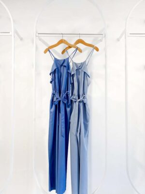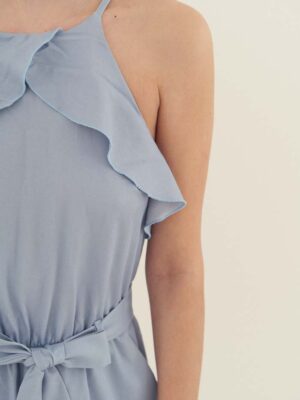 ENTERITO DE TWILL DENIM CON ESCOTE HALTER, VOLADOS, BOLSILLOS, CINTO Y DETALLE EN LA ESPALDA CON BRETELES