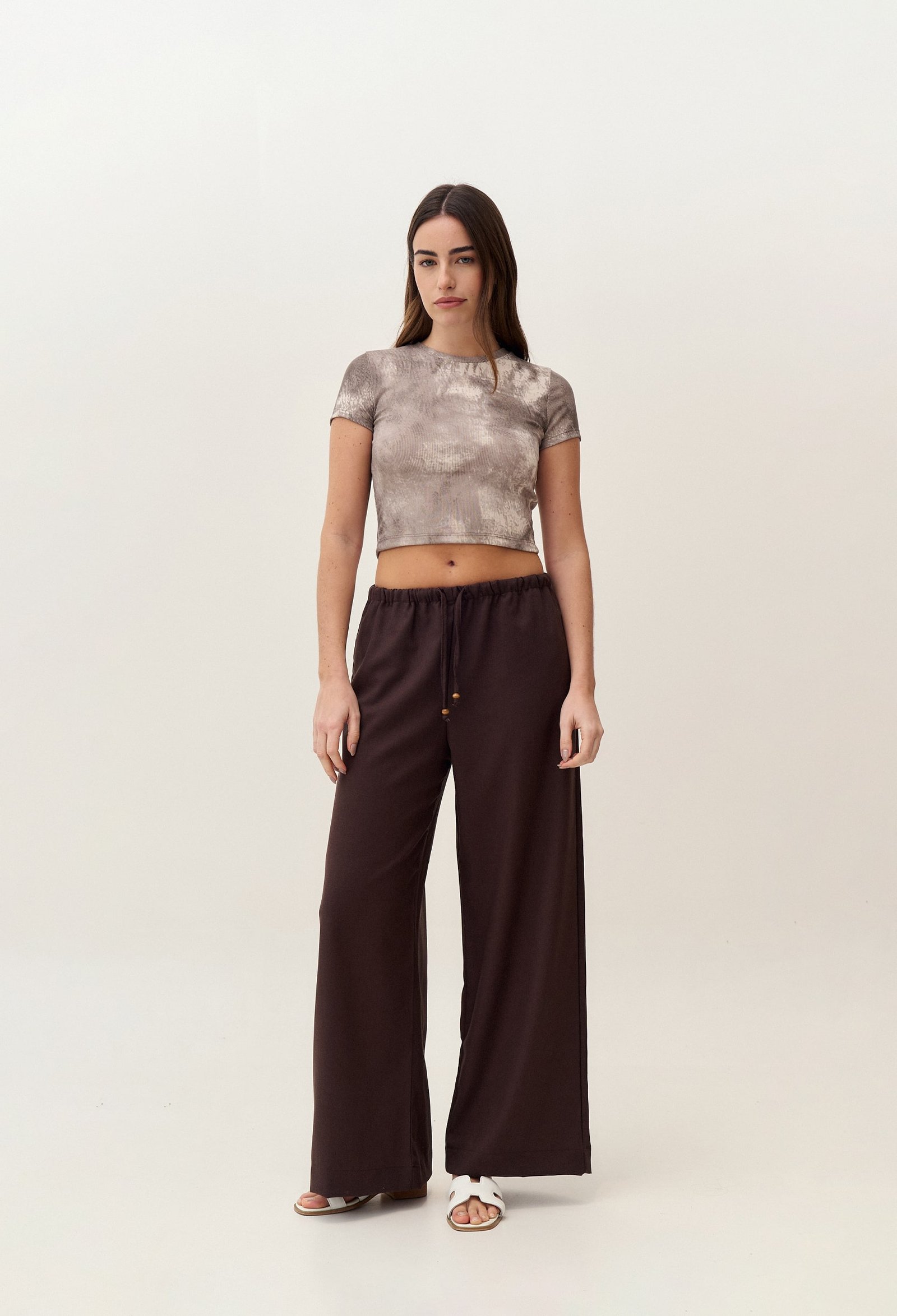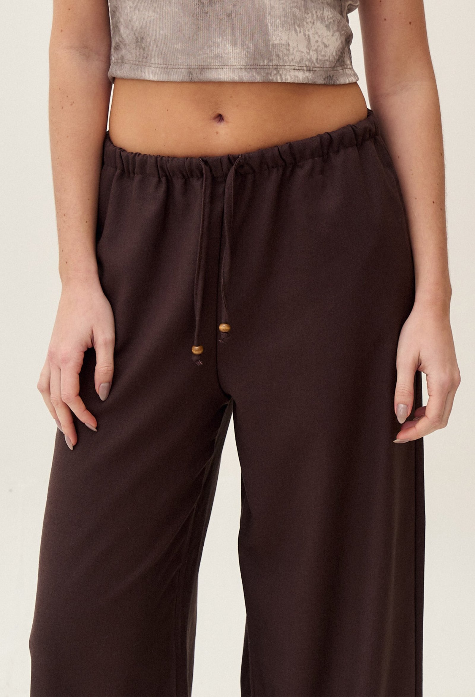 PANTALON DE LINO CON ELASTICO, TIRAS Y DETALLE DE TERMINALES DE MADERA