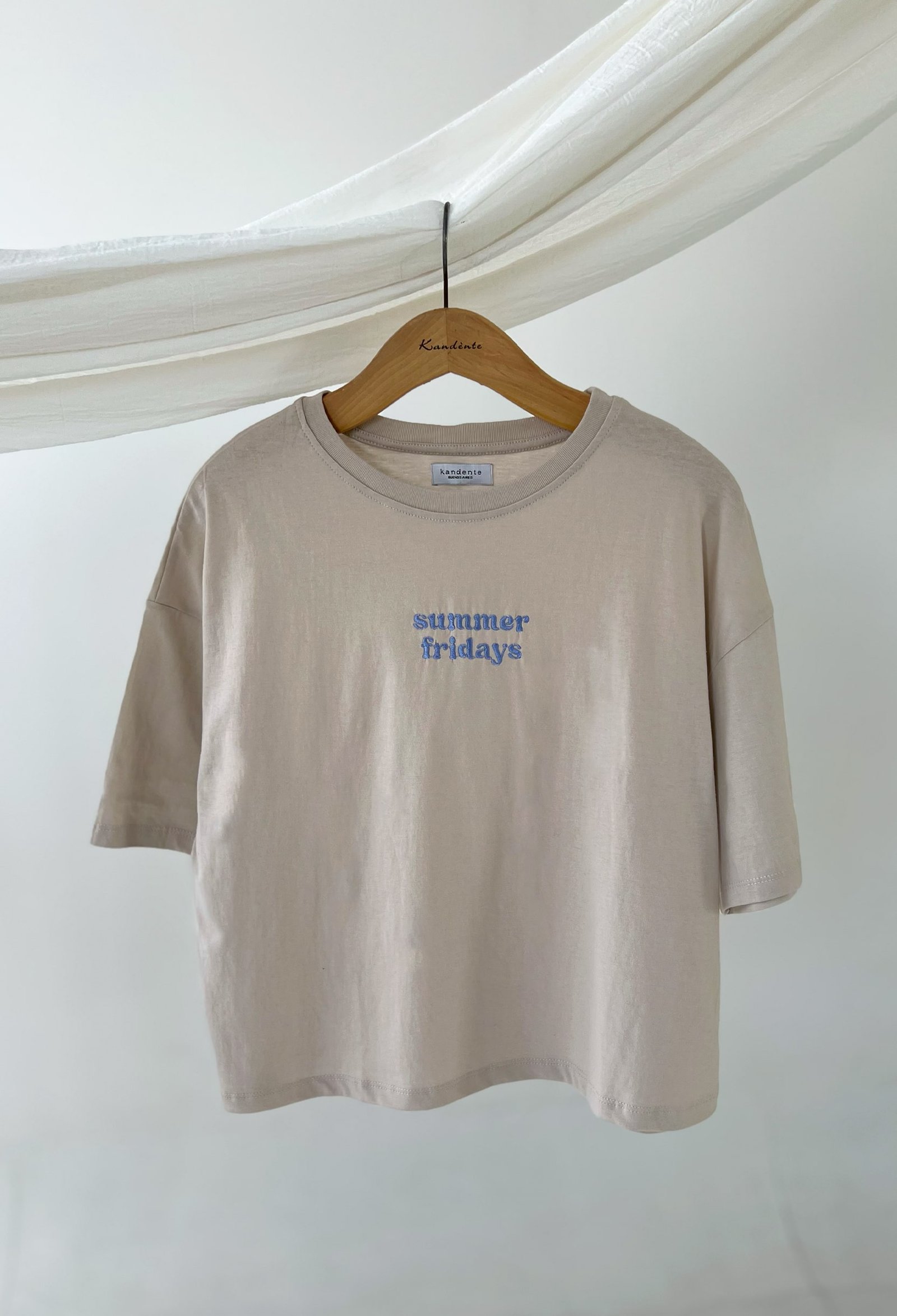 REMERA OVERSIZED DE ALGODON 100% CON BORDADO SUMMER FRIDAYS Y COMPLEMENTO DE RIB EN EL CUELLO