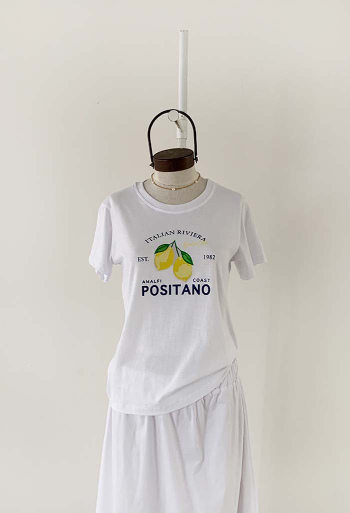 REMERA DE ALGODON 100% CON COMPLEMENTO DE RIB EN EL CUELLO Y ESTAMPA “LIMON POSITANO”