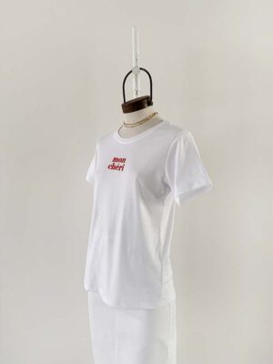 REMERA DE ALGODON CON BORDADO ”MON CHERI” Y COMPLEMENTO DE RIB EN EL CUELLO