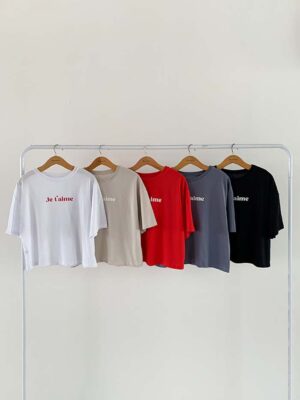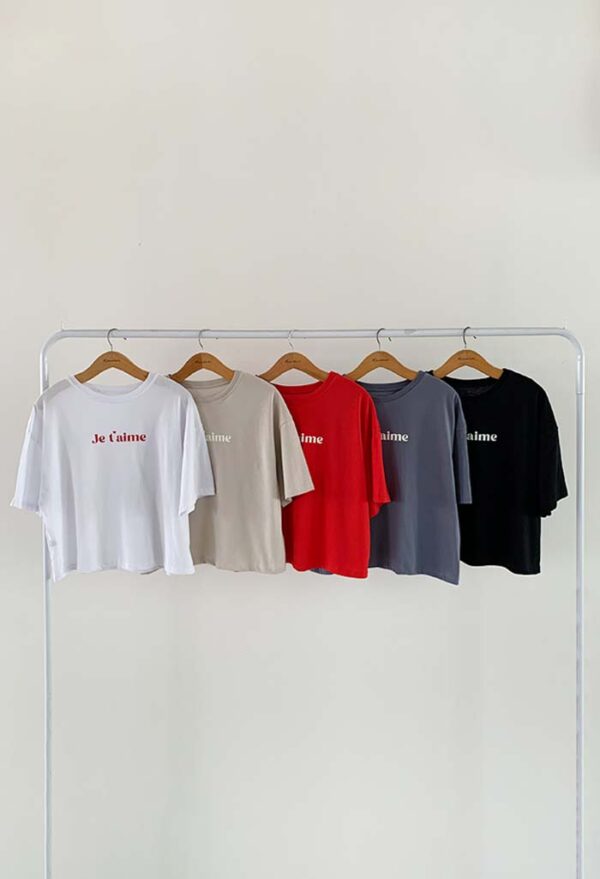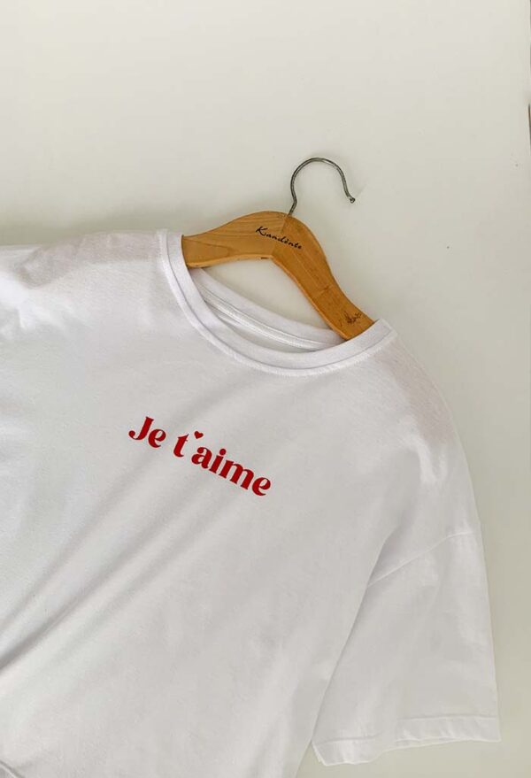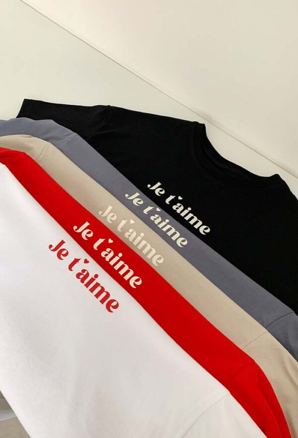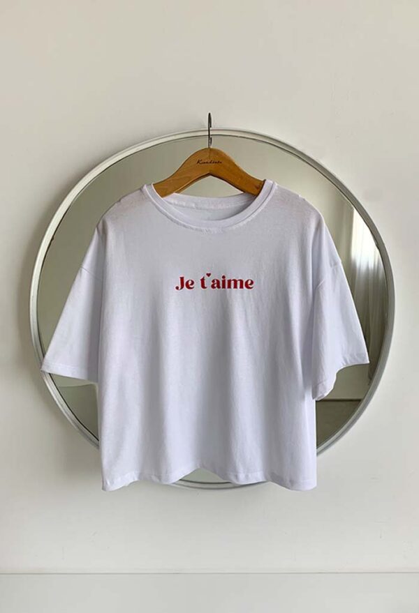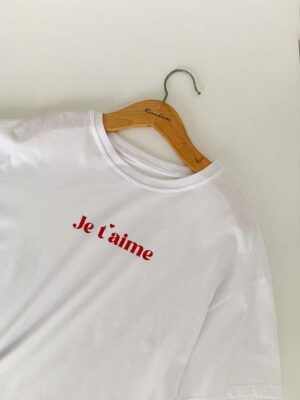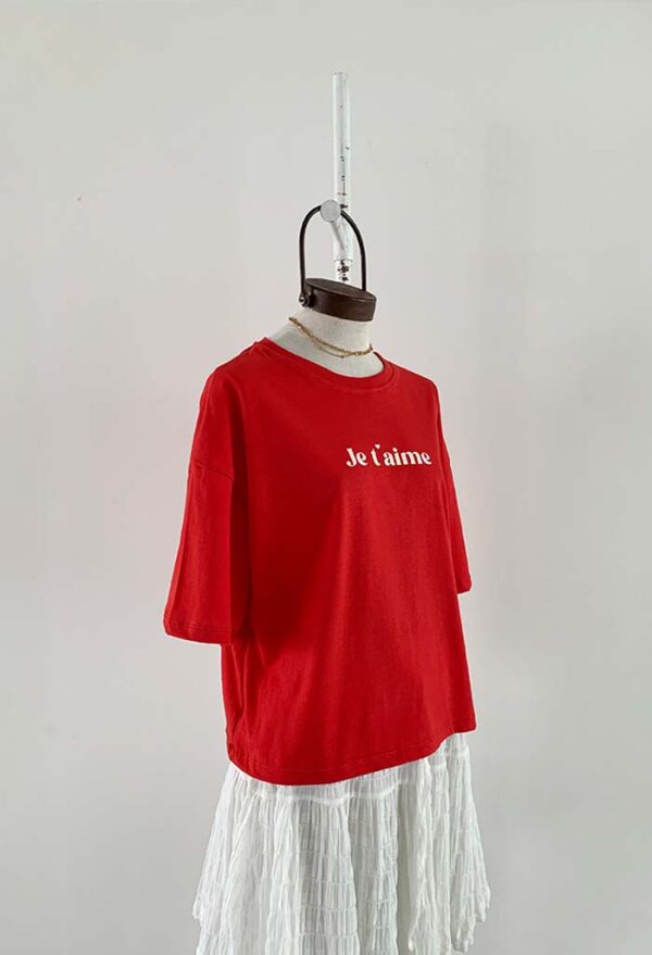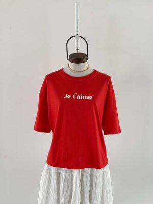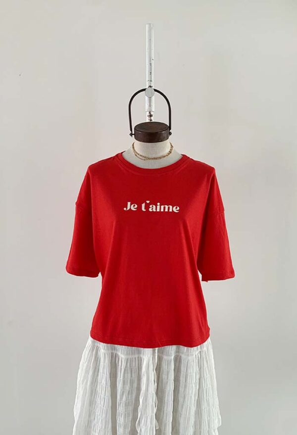 REMERA DE ALGODON CON COMPLEMENTO DE RIB EN EL CUELLO Y ESTAMPA ”JE T’AIME”