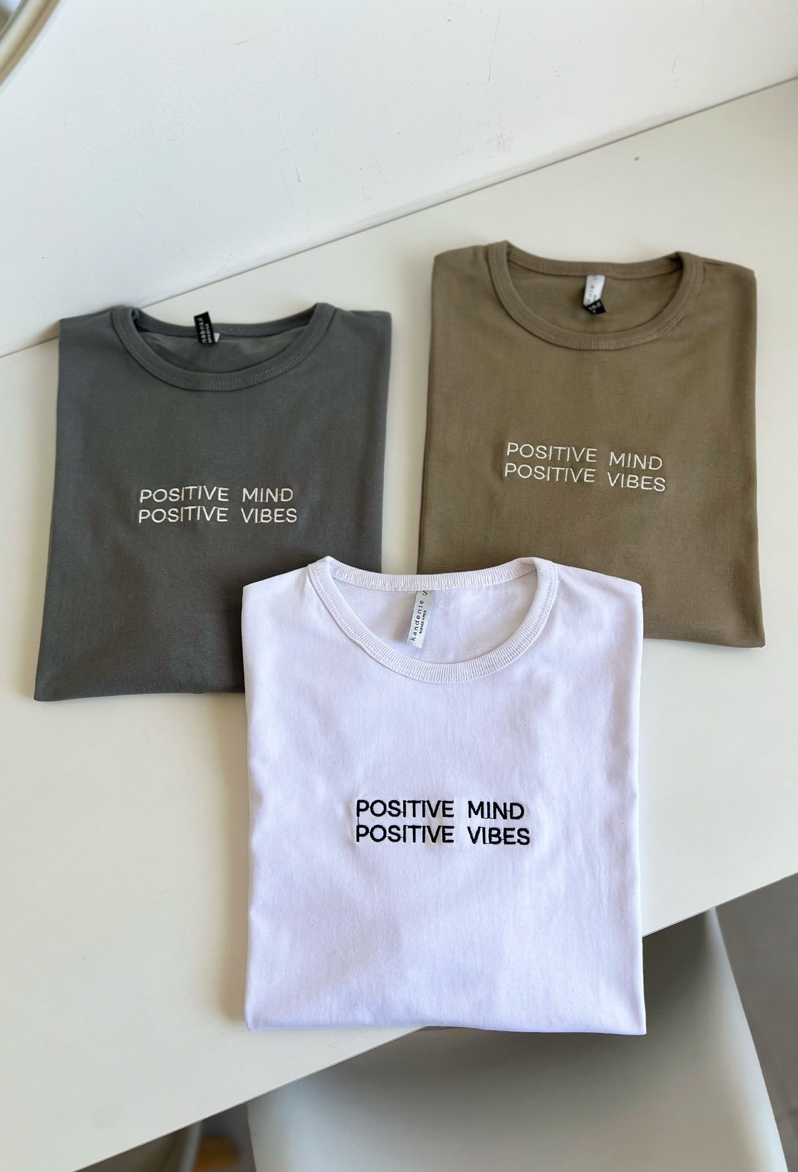 REMERA OVERSIZED DE ALGODON PREMIUM 24/1 CON RIB EN EL CUELLO Y BORDADO POSITIVE VIBES