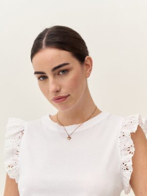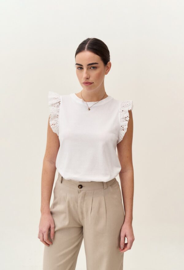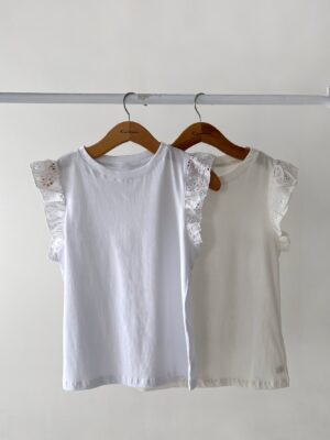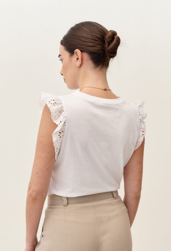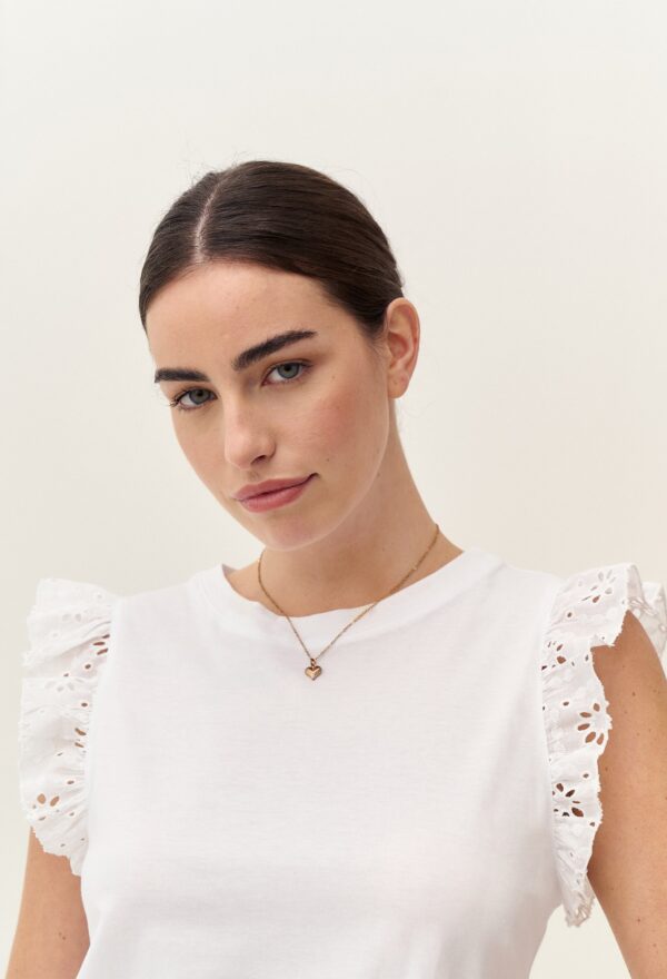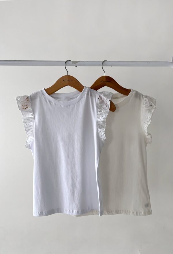 REMERA DE JERSEY ALGODON 30/1 CON VOLADOS DE BRODERIE EN LA SISA