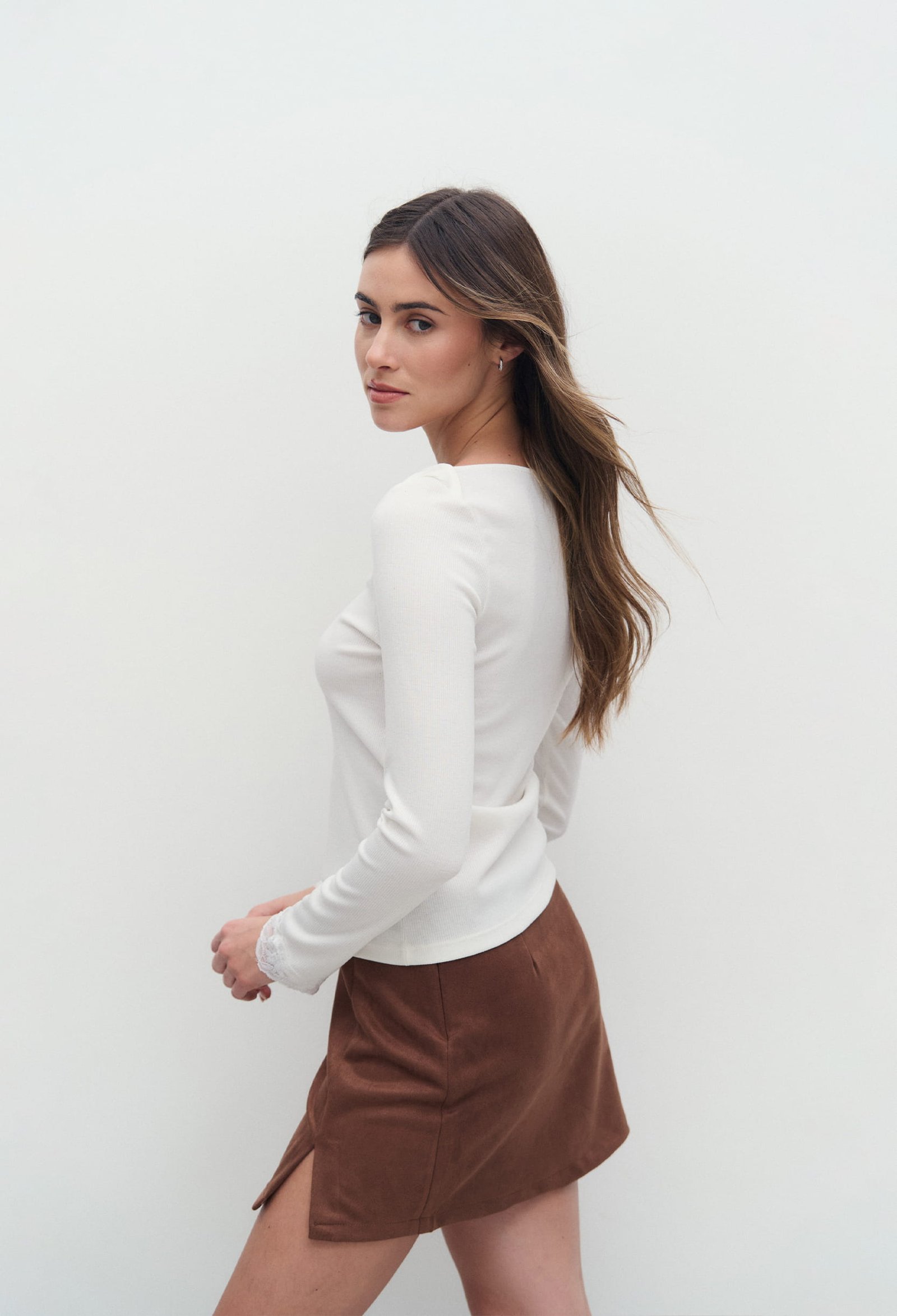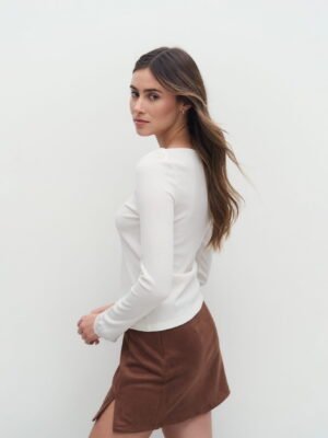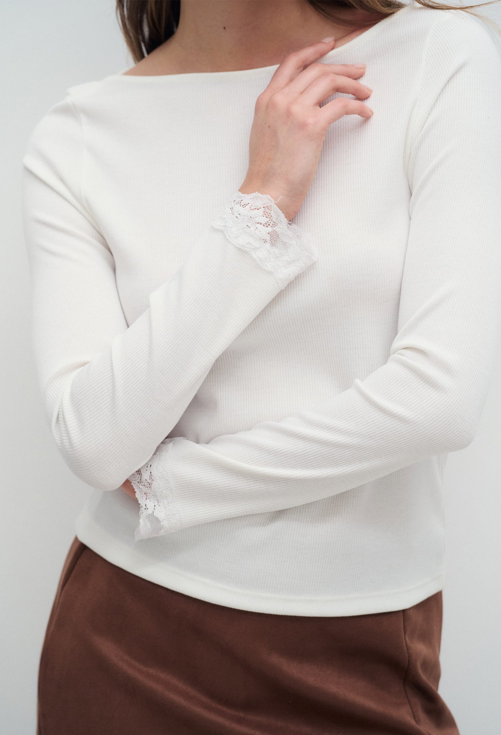 REMERA DE MORLEY CON DETALLE SUPERPOSICIÓN EN ESCOTE, MANGA LARGA CON TERMINACIONES DE PUNTILLA