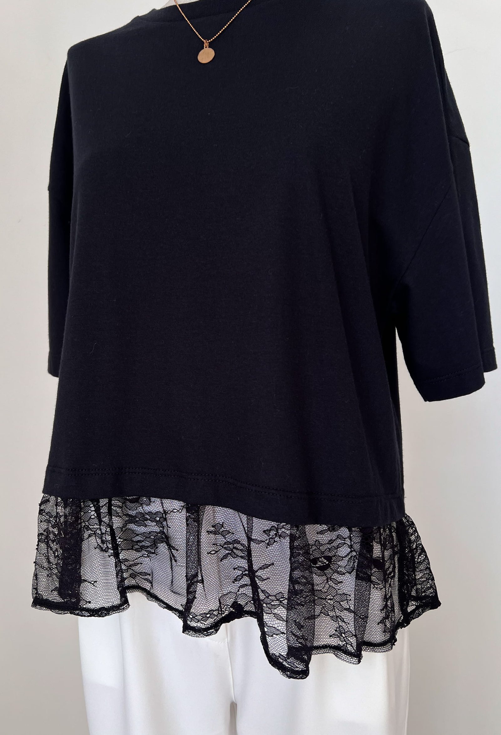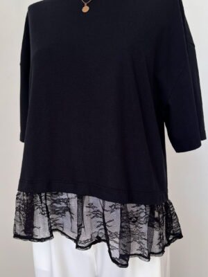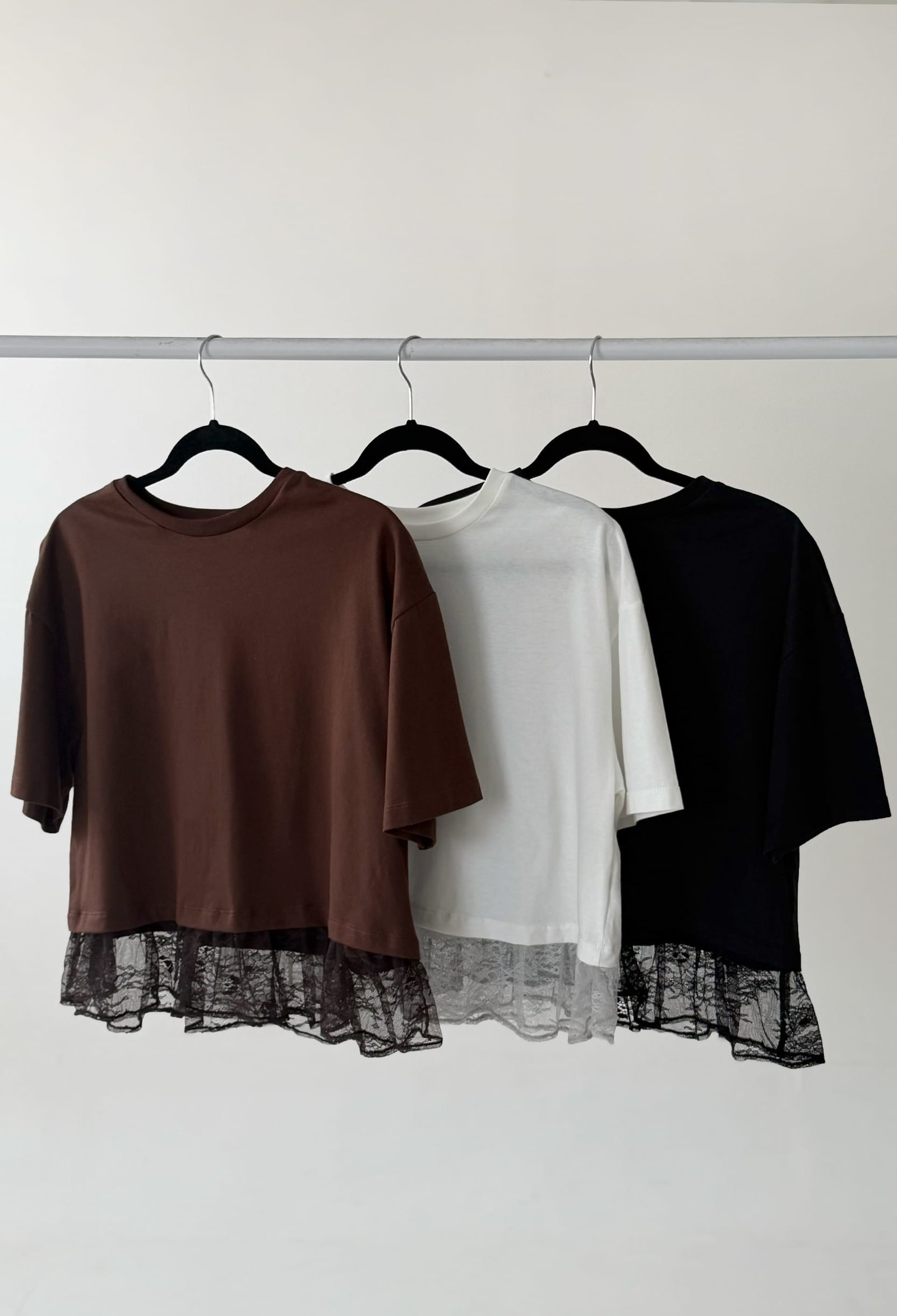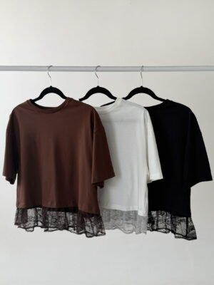 REMERA DE ALGODON 30/1 PREMIUM BRASILEÑO CON COMPLEMENTO EN EL CUELLO Y VOLADOS DE ENCAJE