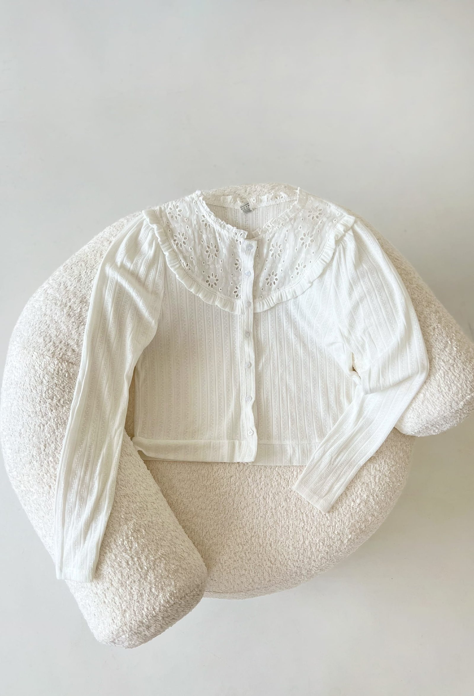 SAQUITO DE TEJIDO FANTASIA Y CANESU DE BRODERIE CON MINI VOLADOS EN EL CUELLO