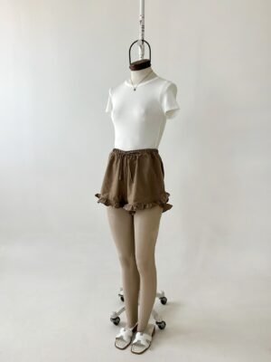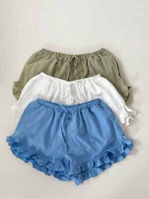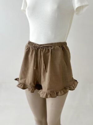 SHORT DE LINO CON ELASTICO EN CINTURA, LAZO ANUDABLE Y TERMINACION CON VOLADOS