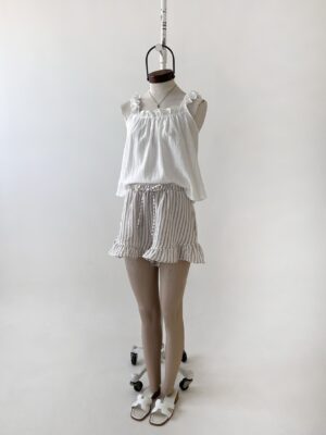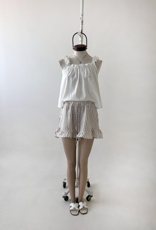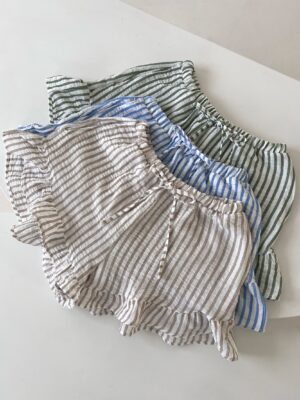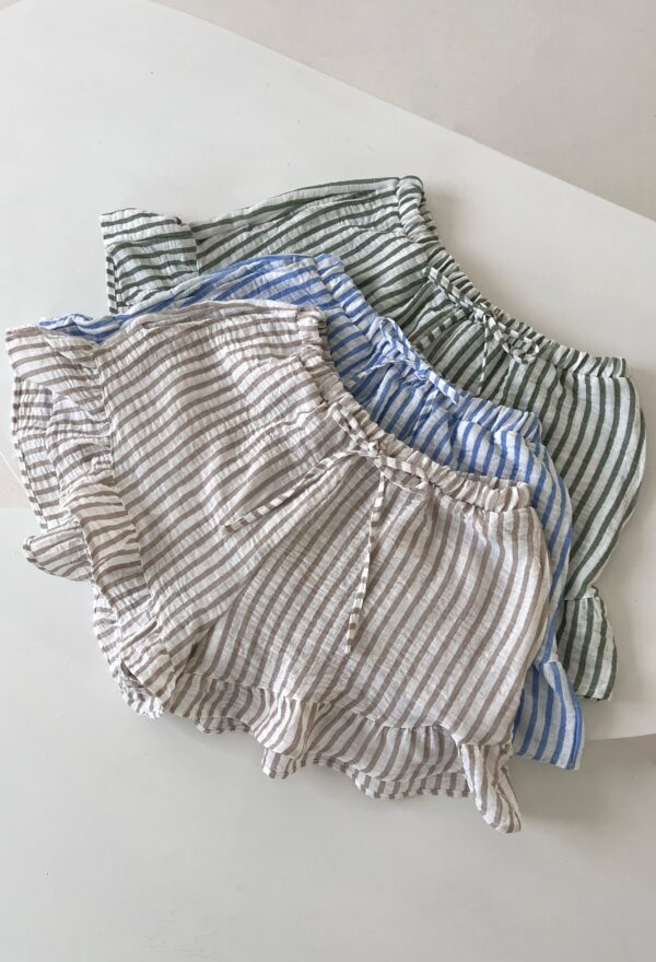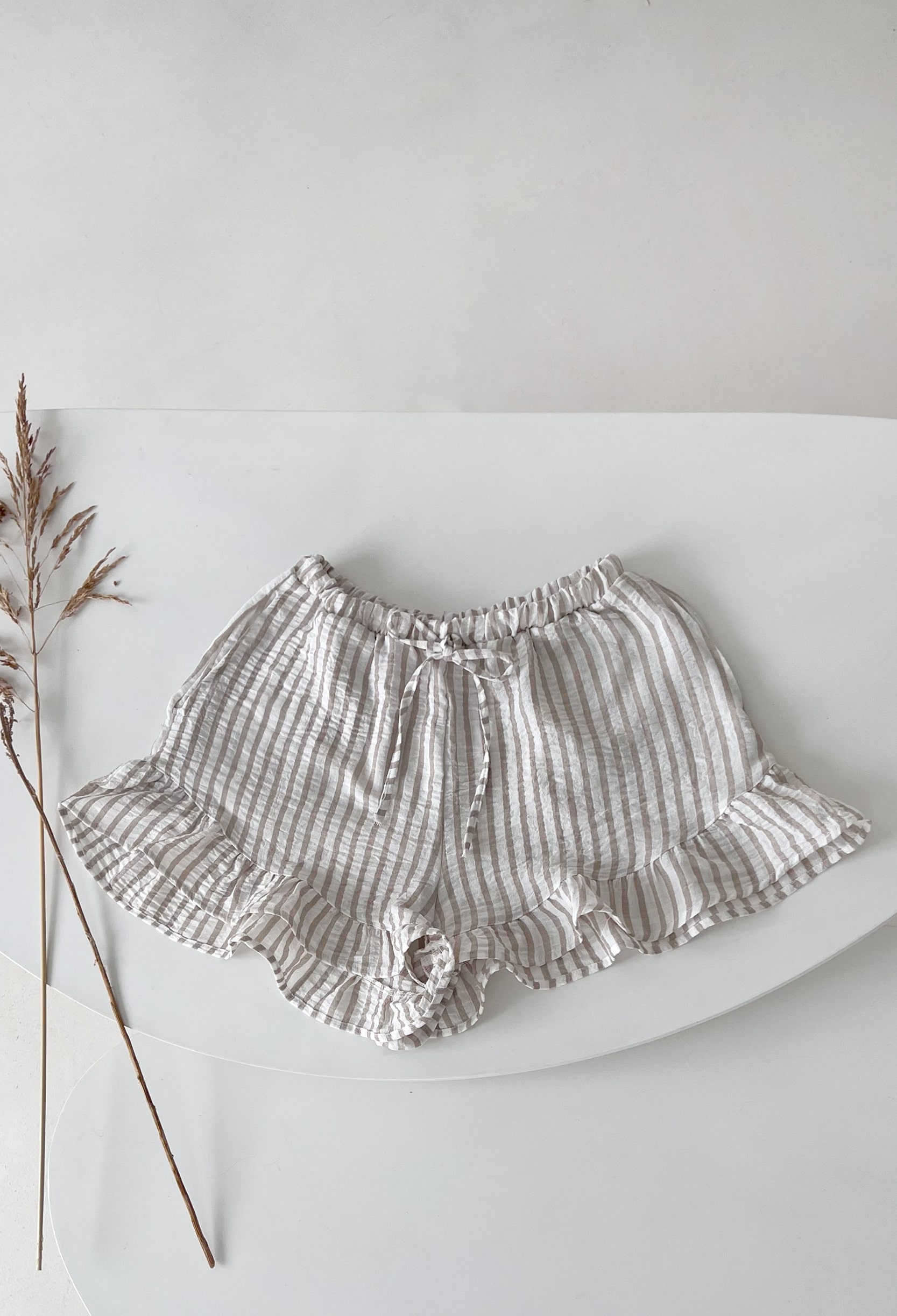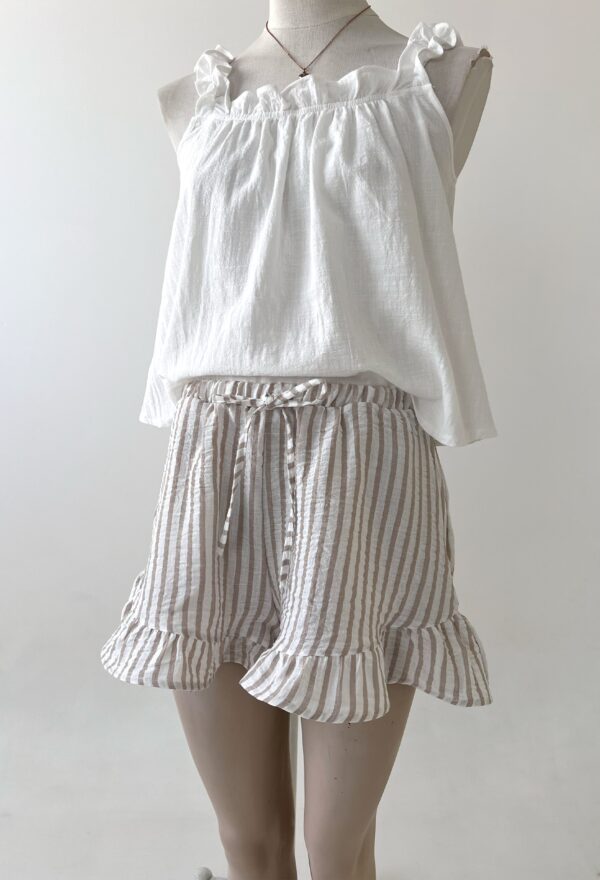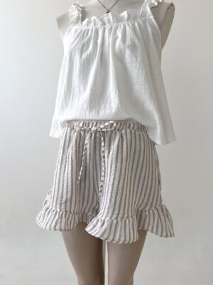 SHORT DE LINO RAYADO CON ELASTICO EN CINTURA Y LAZO, TERMINACIONES CON VOLADOS
