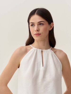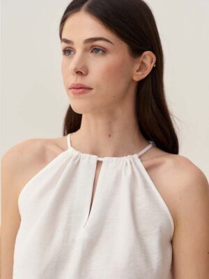 TOP DE LINO CUELLO HALTER CON APERTURA EN ESCOTE, FRUNCES EN DELANTERO Y ESPALDA Y TIRAS REGULABLES