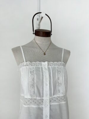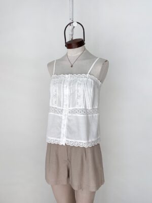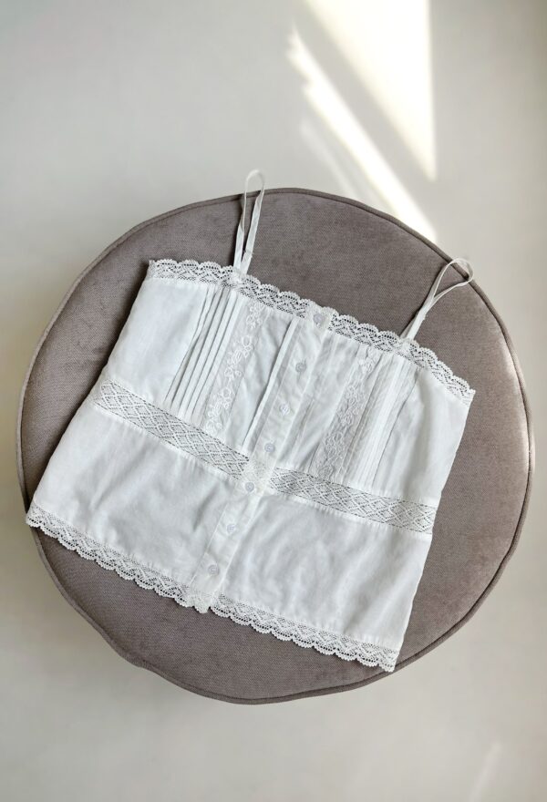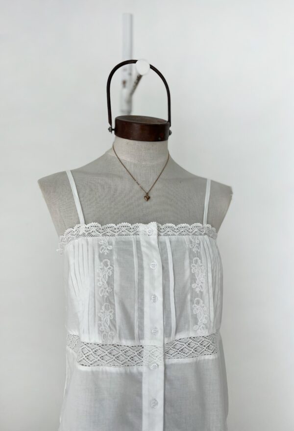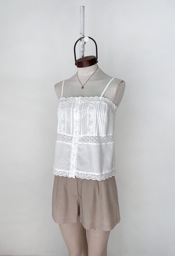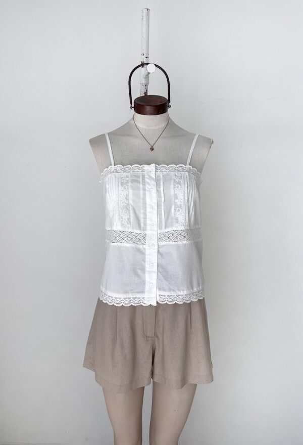 TOP CON BORDADO, ALFROZAS Y BOTONES EN DELANTERO, DETALLES EN PUNTILLA Y TIRAS REGULABLES