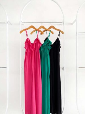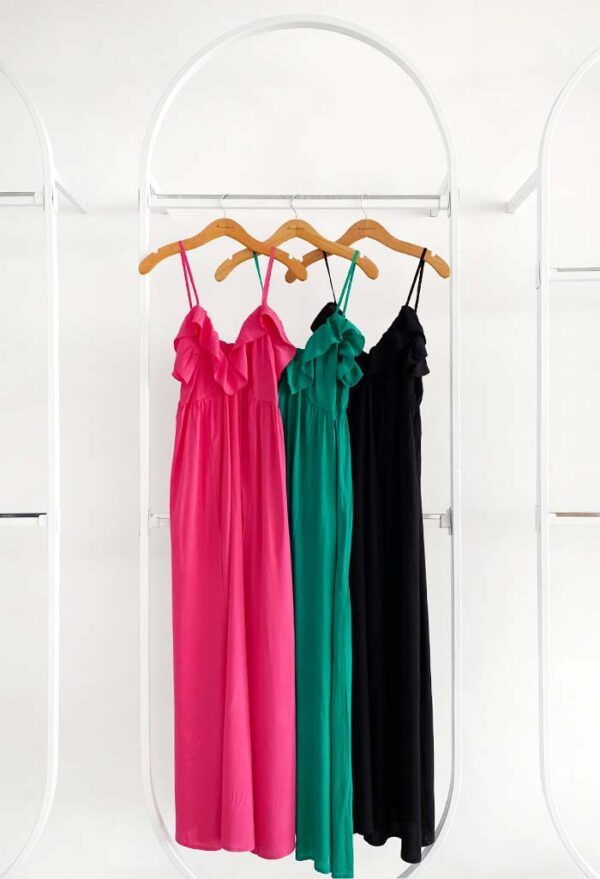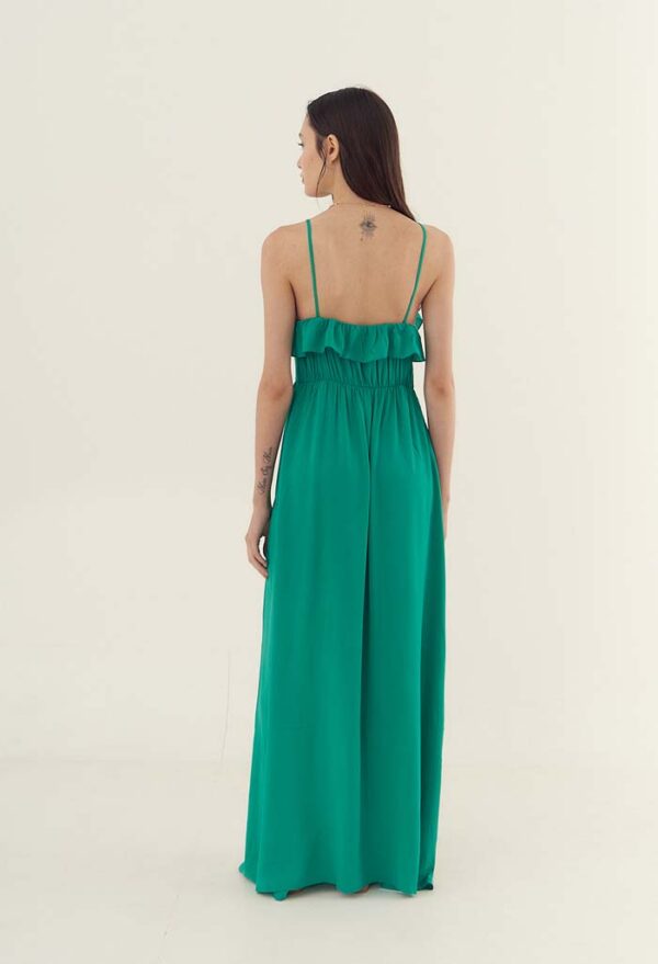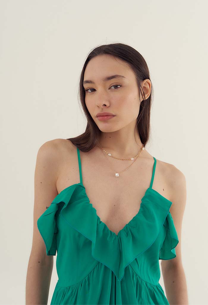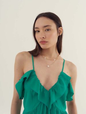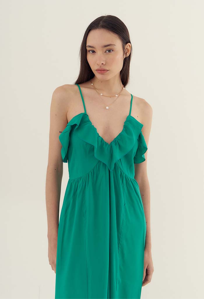 VESTIDO DE FIBRANA CON VOLADOS EN EL ESCOTE